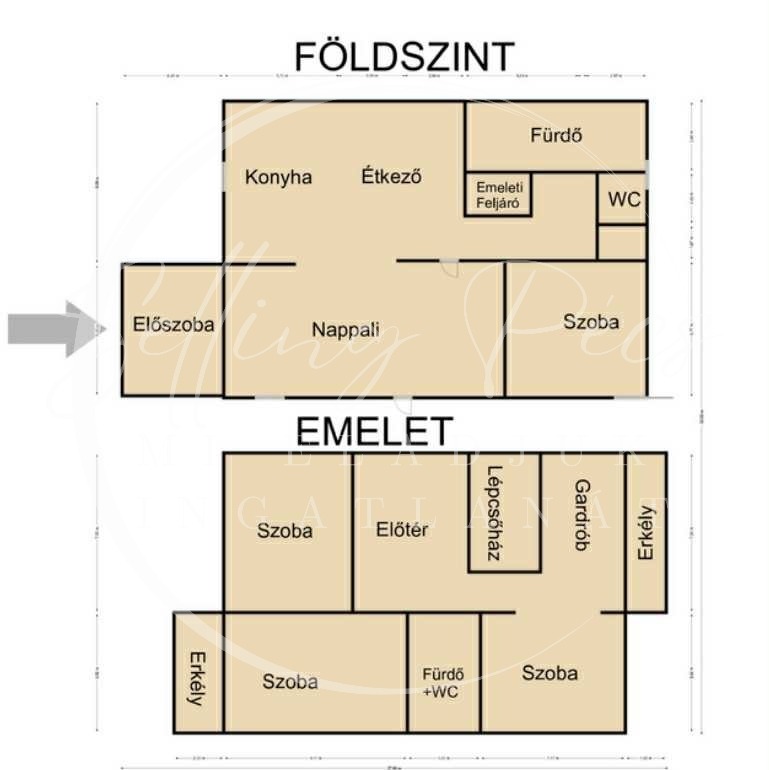 Emelet: előtér, 3 szoba, fürdőszoba, külön WC