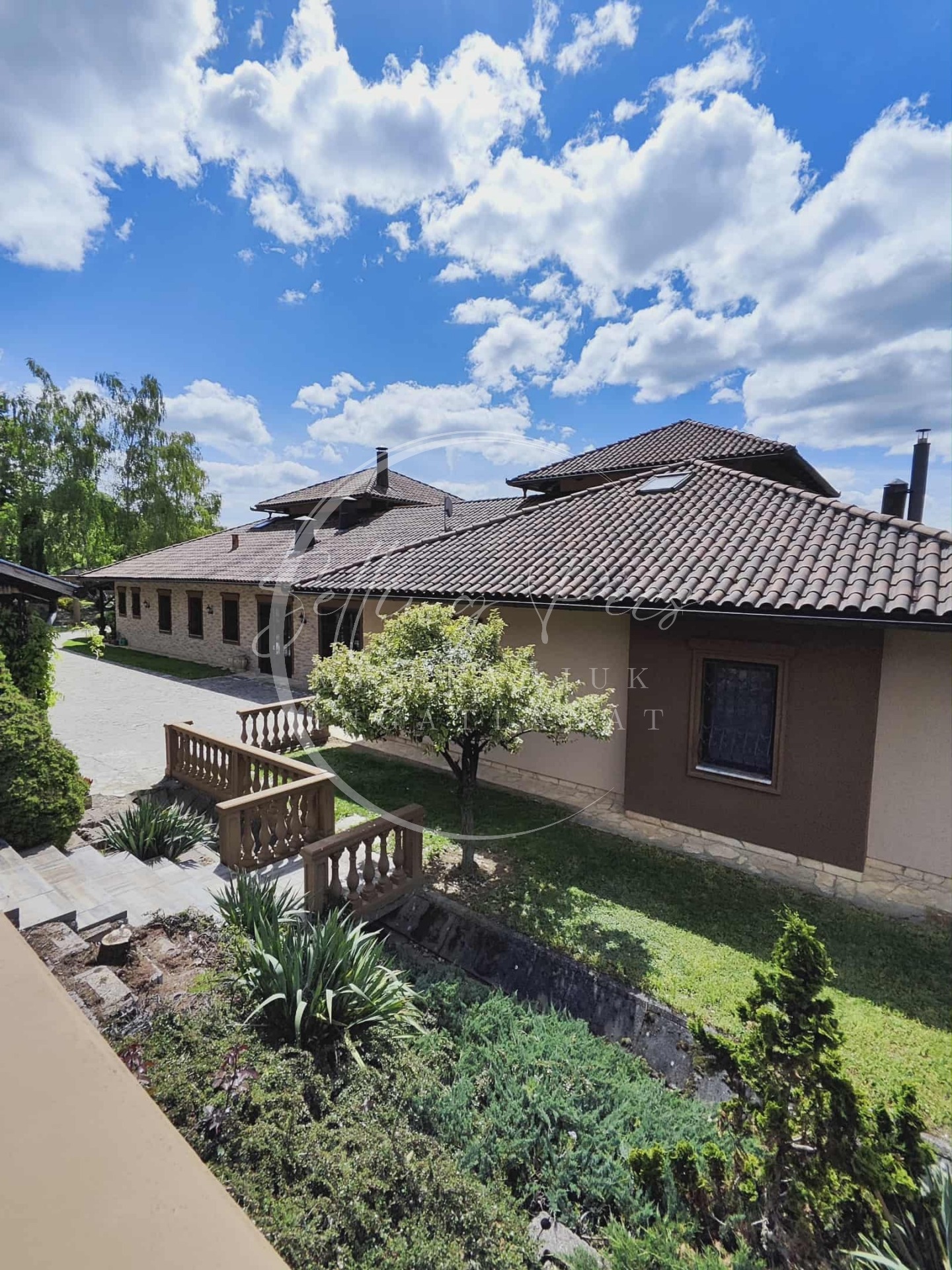 A főépületbe a ház déli oldalán található főbejáraton jutunk, páratlan panorámájú térkövezett járdán, örökzöld és napfény imádó növények mentén.