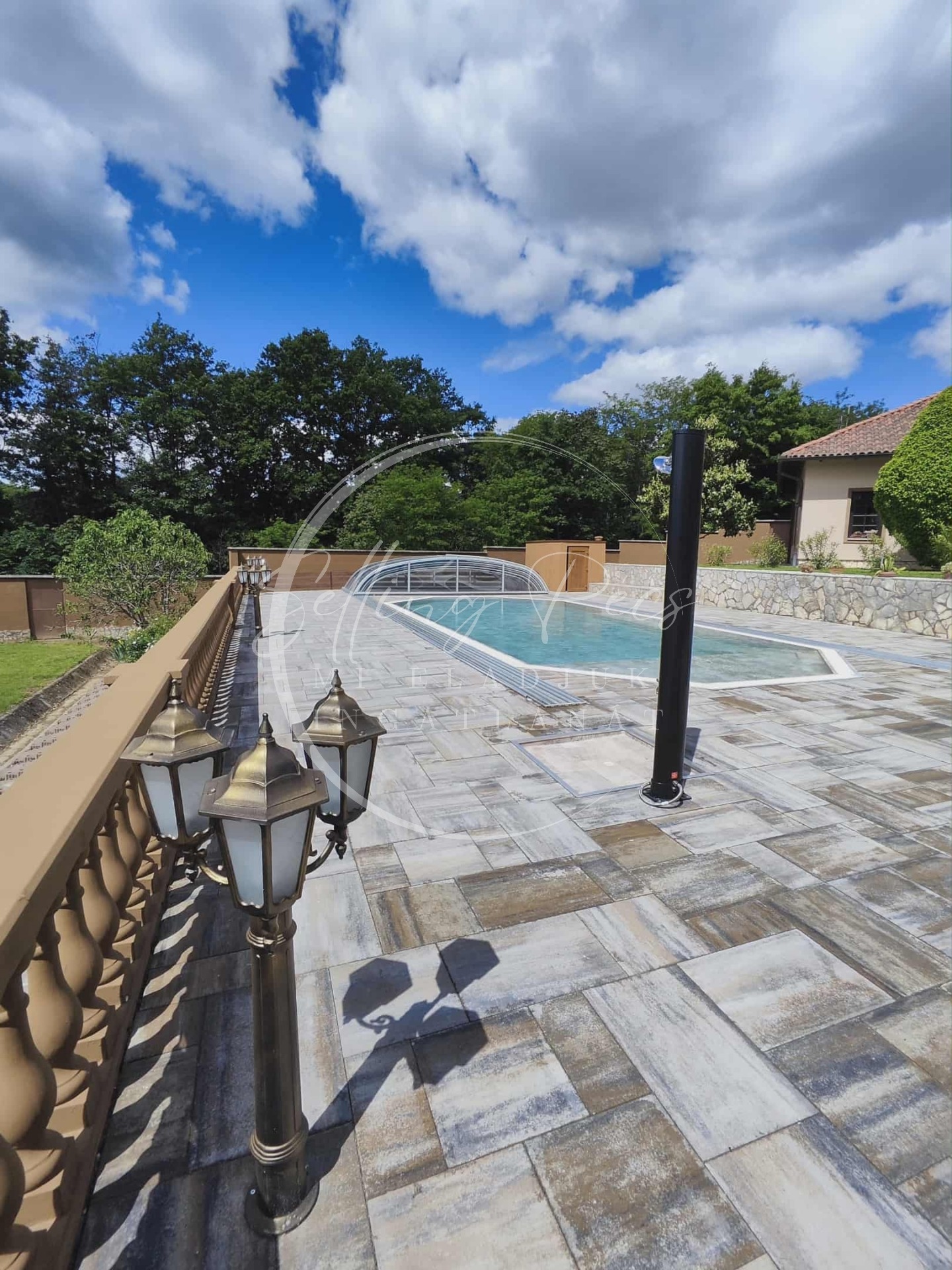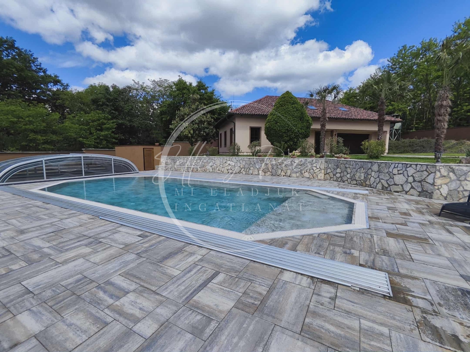 A ház mögött, a pálmafák tövében, egy 75 m3 -es medence és egy tágas napozóterasz tárul elénk, mely mellett egy bográcsozó, grillező helyezkedik el. A medence lefedhető, így az első napsugarak már a medence vizének fűtéséről gondoskodnak.