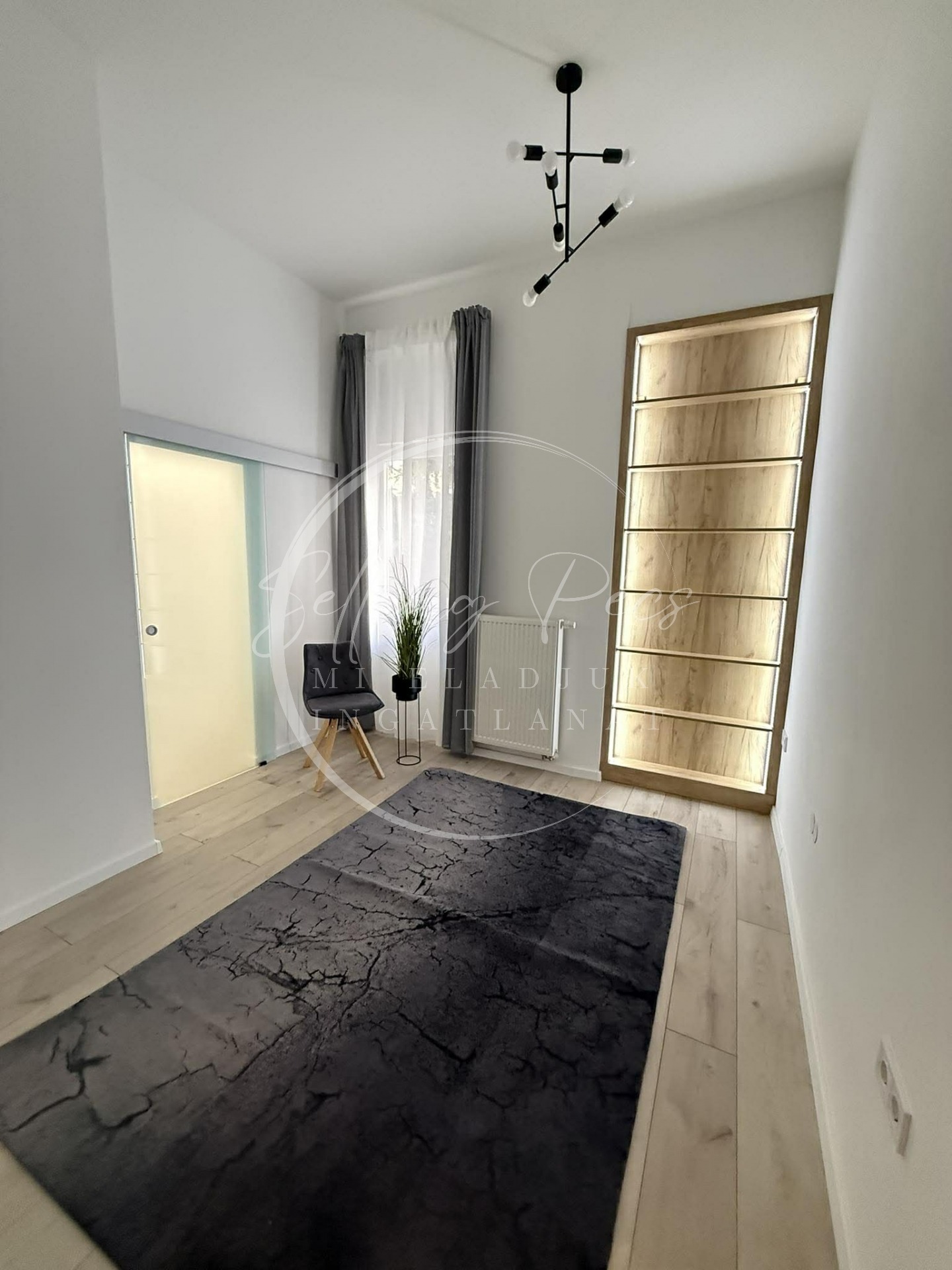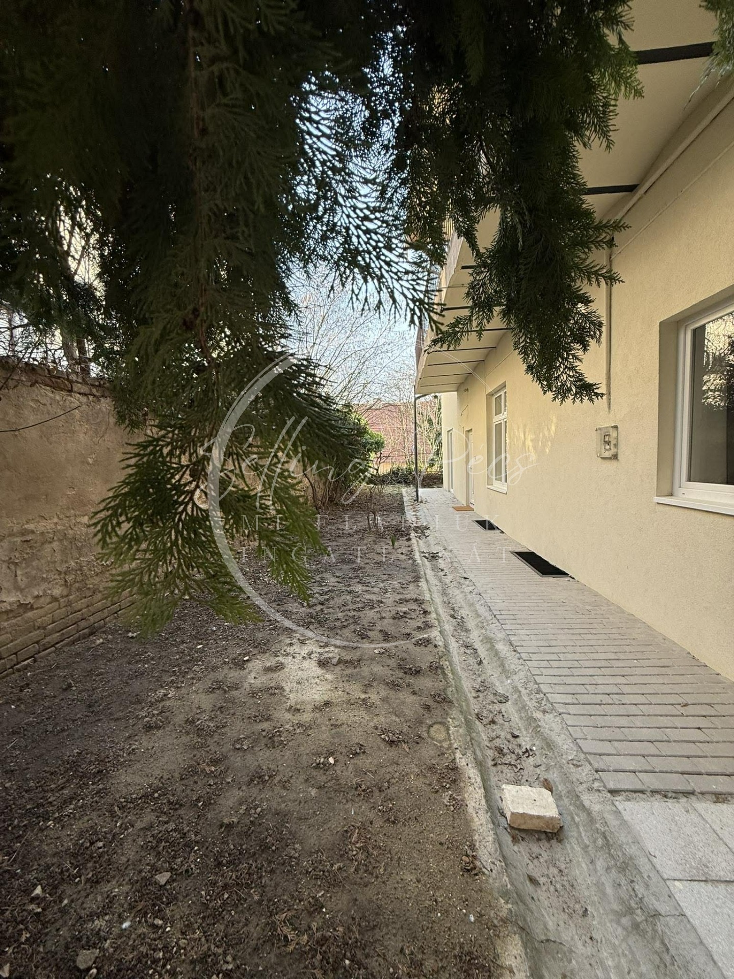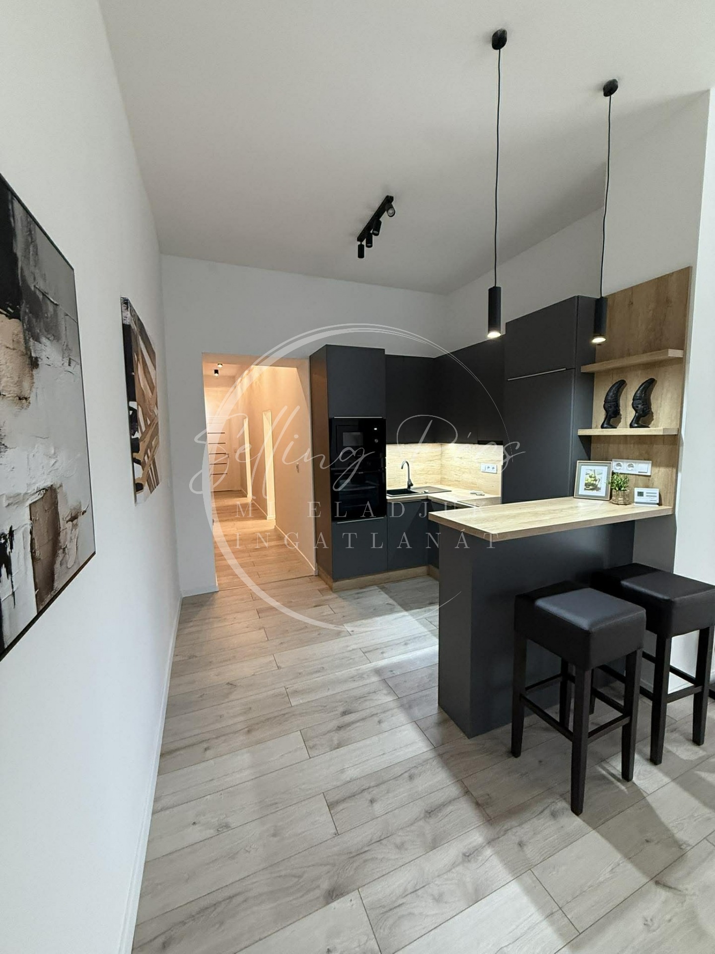 A belső tér kialakítása: amerikai konyha–étkező–nappali, két hálószoba, valamint egy külön gardróbhelyiség szolgálja a kényelmet. Hangulatos, privát kis kert a lakás előtt.