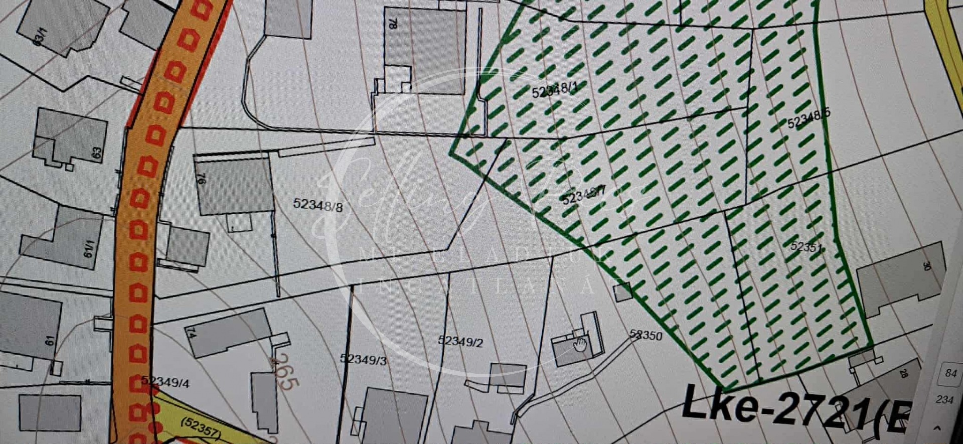 Szabadon álló ház építhető a nyél végére. A zöld terület nem beépíthető.