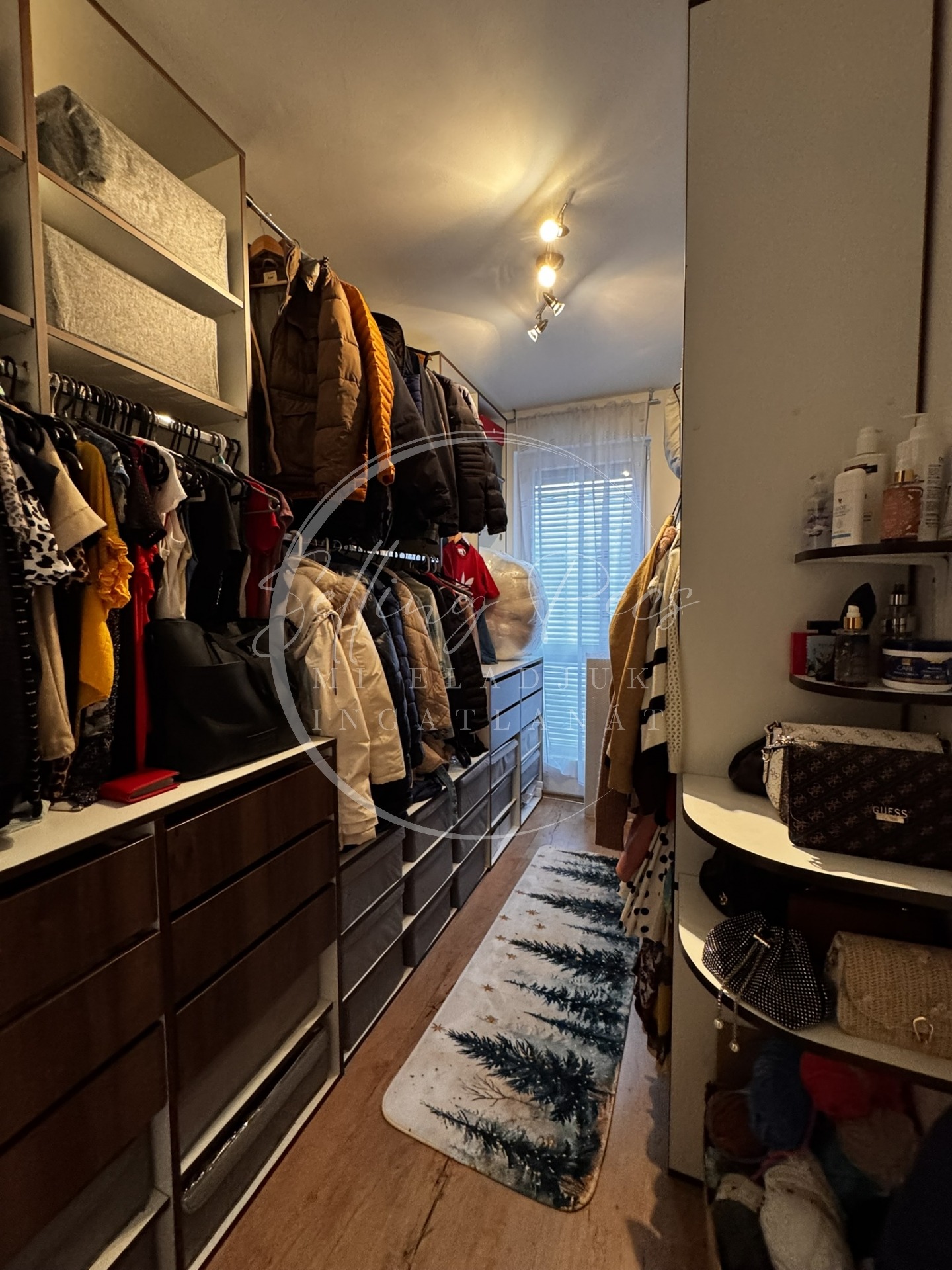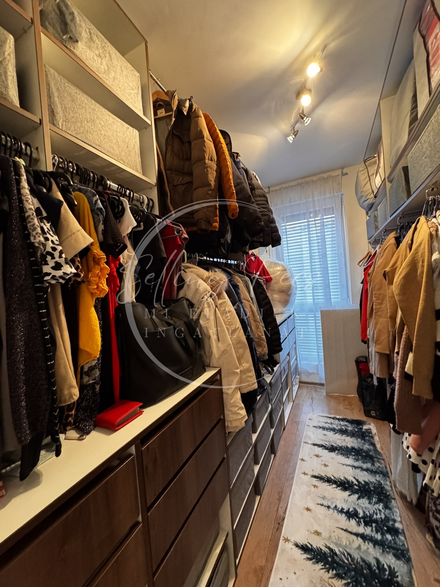 A félszoba beépített gardróbszobaként funkcionál, amely kiváló tárolási lehetőséget biztosít. Az előszobában egy nagyméretű, fiókos cipősszekrény került kialakításra.